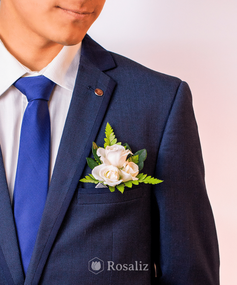 Botonier de mini rosas blancas con follaje y clip para engachar.