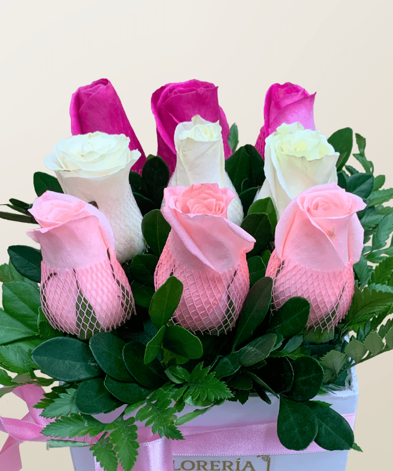 Box blanco con 9 rosas tricolor rosado, blanco y fucsia con follaje verde