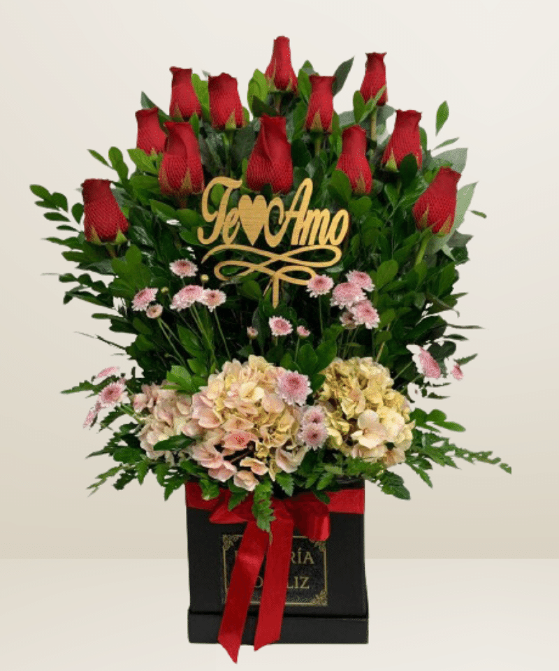 Box cuadrado negro con 12 rosas rojas y follaje variado