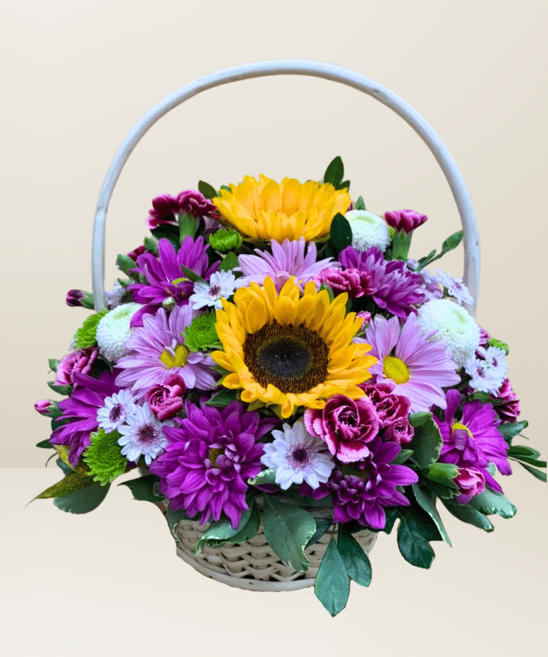 Canasta variada con girasoles y follaje verde