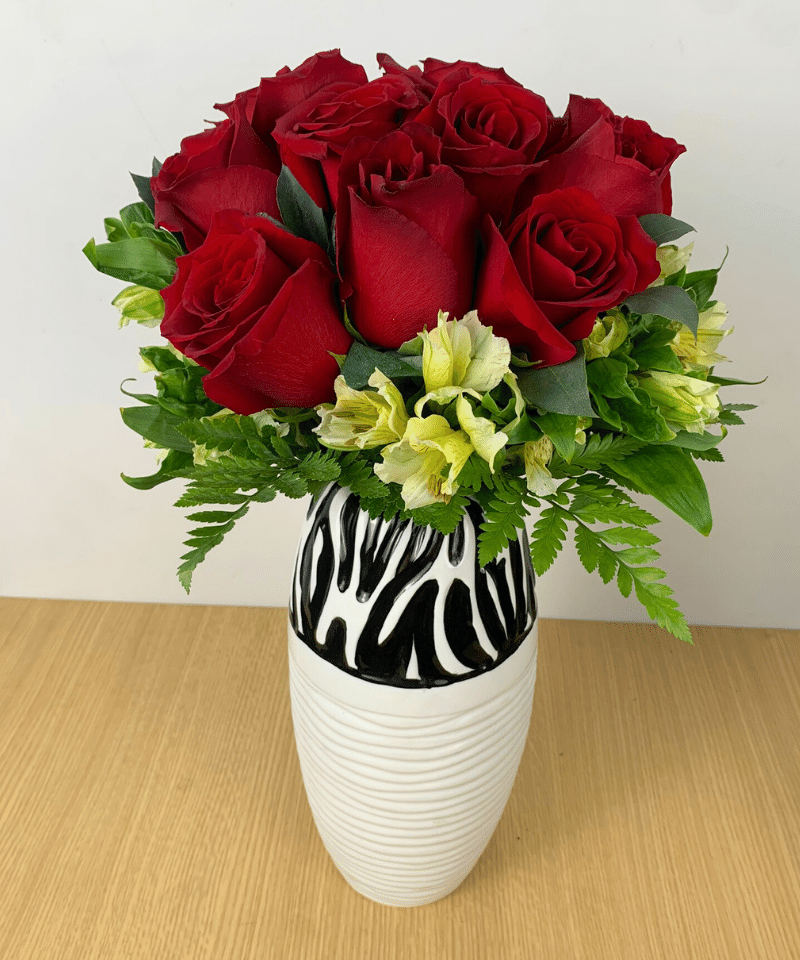 Arreglo de rosas rojas con astromelias cremas en florero blanco con negro