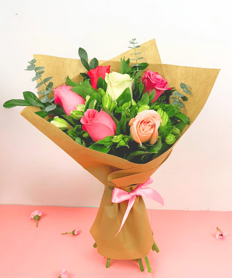 Mini ramo buchón de 6 rosas con astromelias cremas y follaje