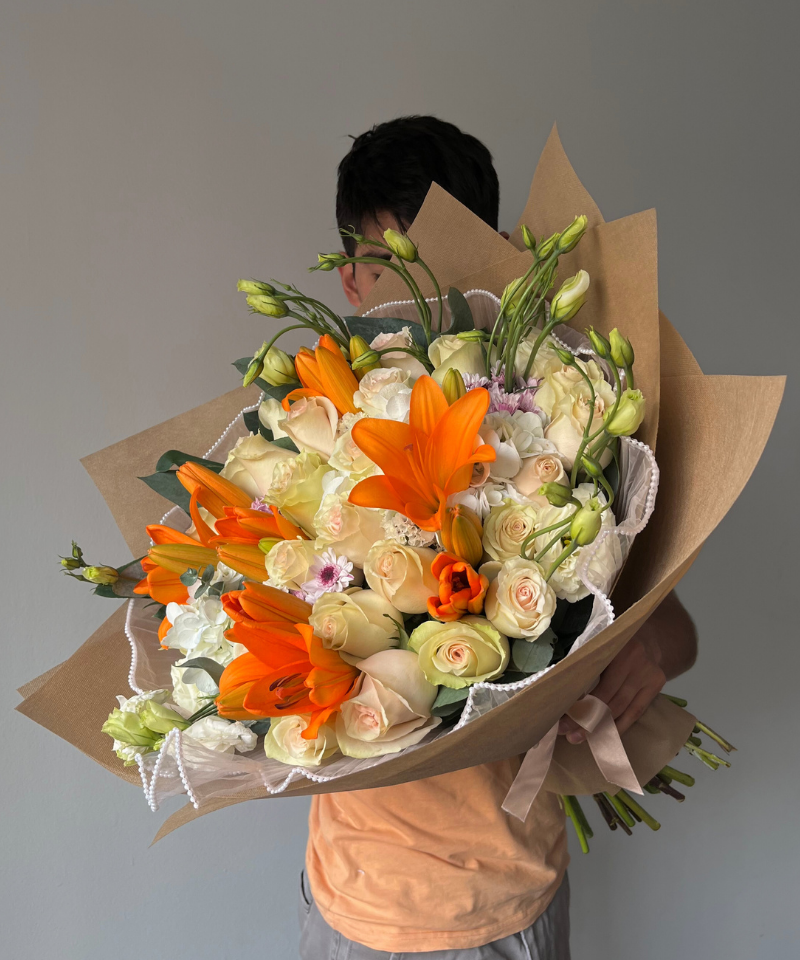 Ramo con rosas y follaje blanco acompañado con lirios naranjas.