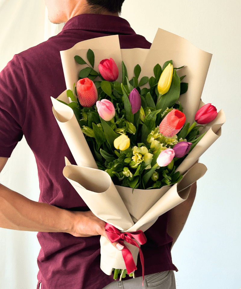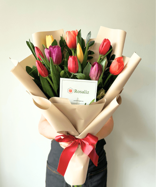 Ramo de 10 tulipanes multicolor con follaje