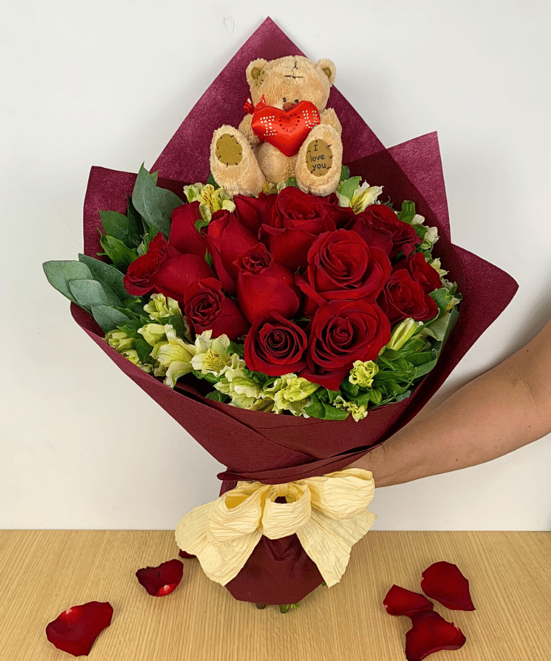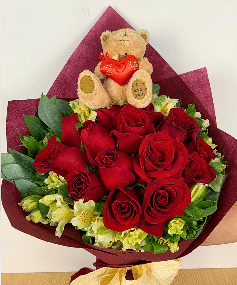 Ramo de 15 rosas rojas con astromelias y follaje verde