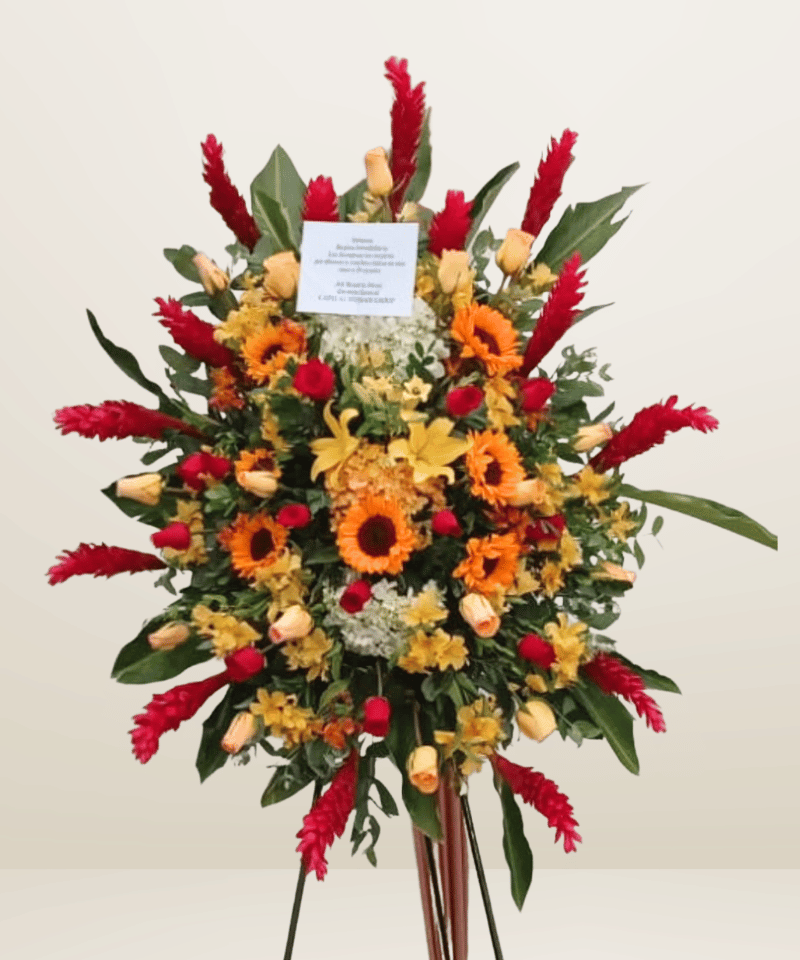 Trípode con girasoles, hortencias, rosas, flores varias con follaje verde